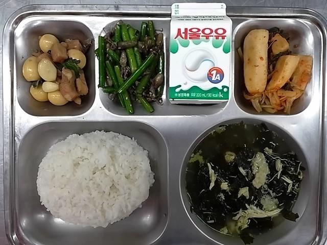 조식 : 흰밥, 닭고기미역국, 메추리알돈육장조림, 마늘쫑꼴뚜기볶음, 깍두기, 우유