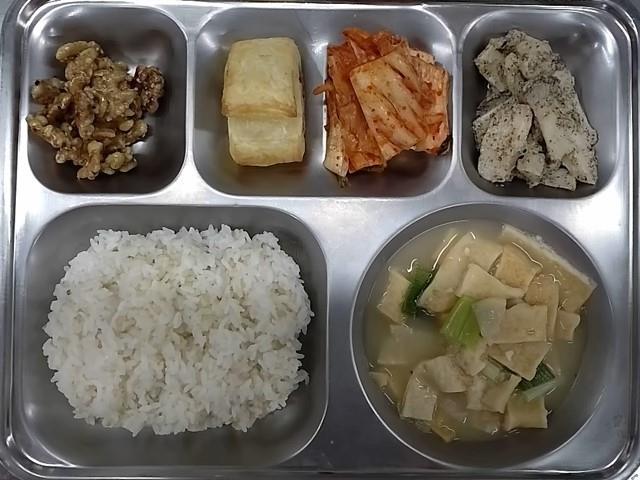 조식 : 현미밥, 사각엄구국, 깐호두멸치볶음, 새송이들깨볶음, 배추김치, 머핀