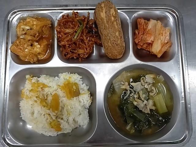 중식 : 고구마밥, 바지락배추된장국, 진미채간장조림, 치즈불닭, 배추김치, 생크림크로칸슈