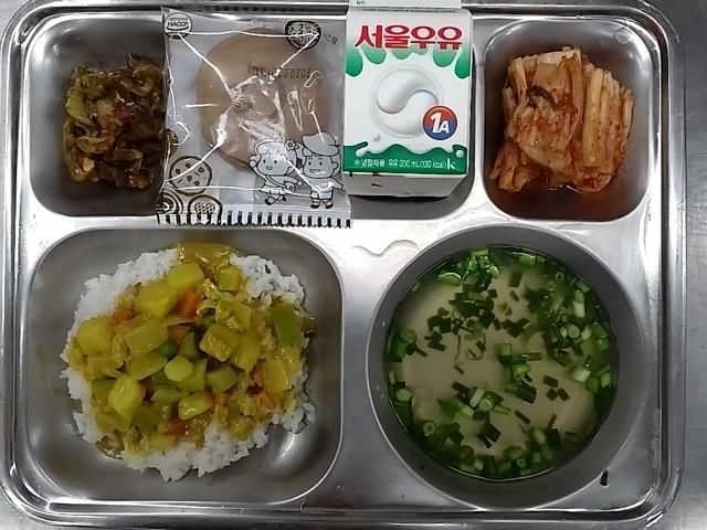 석식 : 카레라이스 , 맑은우동국, 오이지, 배추김치, 스마일초코팬케이크, 우유