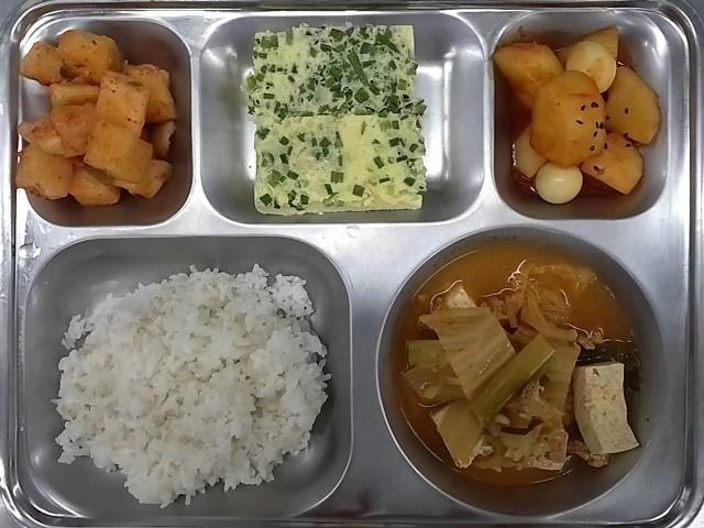 조식 : 발아현미밥, 돈육김치찌개, 맛살계란찜, 메알감자매운조림, 깍두기