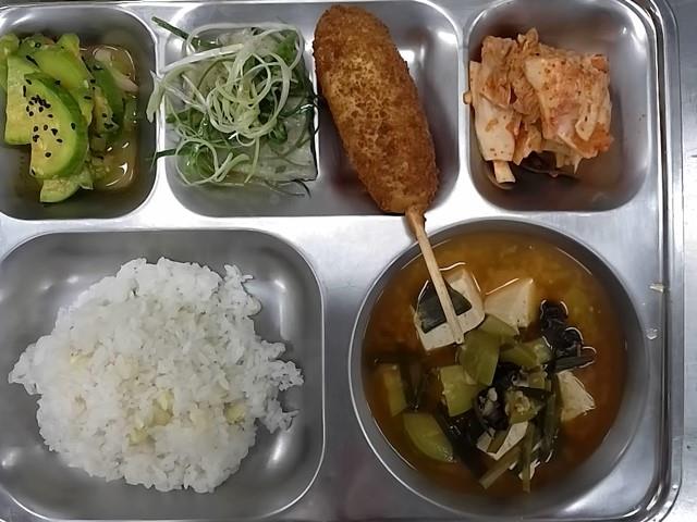 석식: 옥수수밥, 우렁된장찌개, 코다리구이(파토핑), 호박새우젓볶음, 배추김치, 모짜렐라핫도그