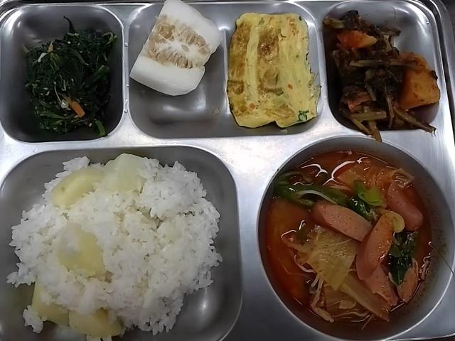 중식: 감자밥, 부대찌개, 깻잎순볶음, 야채계란말이, 백김치, 참외