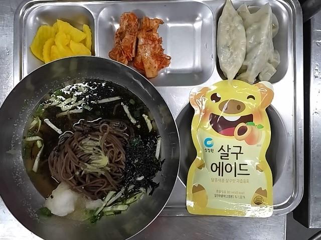 중식 : 메밀소바, 왕교자만두+간장, 단무지, 배추김치, 살구에이드