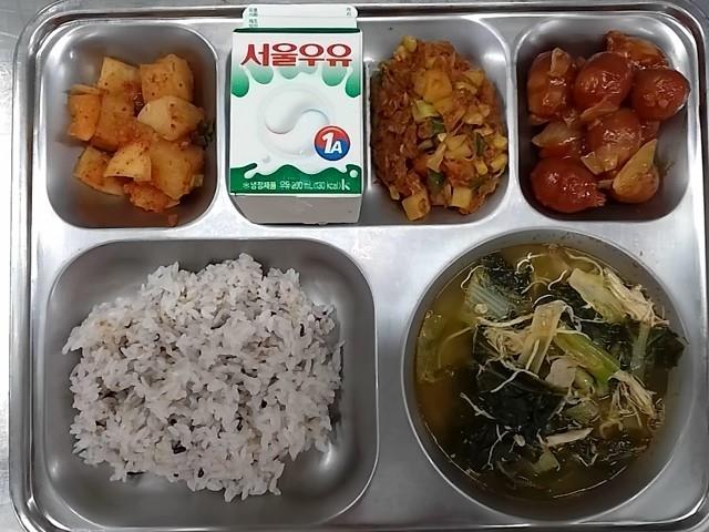조식 : 혼합잡곡밥, 닭배추국, 고추참치야채볶음, 비엔나야채볶음, 깍두기, 우유