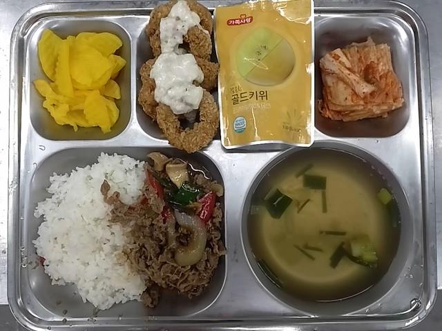 중식 : 맑은우동국, 오리불고기덮밥. 오징어링튀김/락교드레싱, 치자단무지, 깍두기, 골드키위쥬스