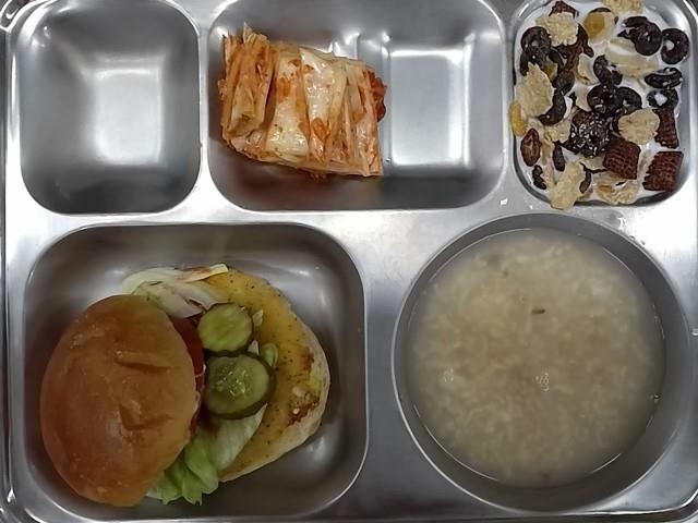 조식 : 리얼치즈버거, 배추김치, 숭늉, 씨리얼2+우유