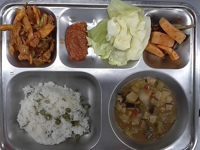 석식: 완두콩밥, 호박버섯강된장, 양배추쌈+쌈장, 오삼불고기, 열무김치, 요거트 쑥쑥