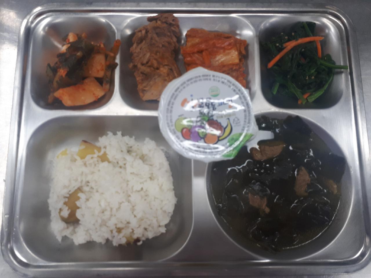 고구마밥, 소고기미역국, 돼지고기김치찜, 시금치나물, 총각김치, 모듬과일