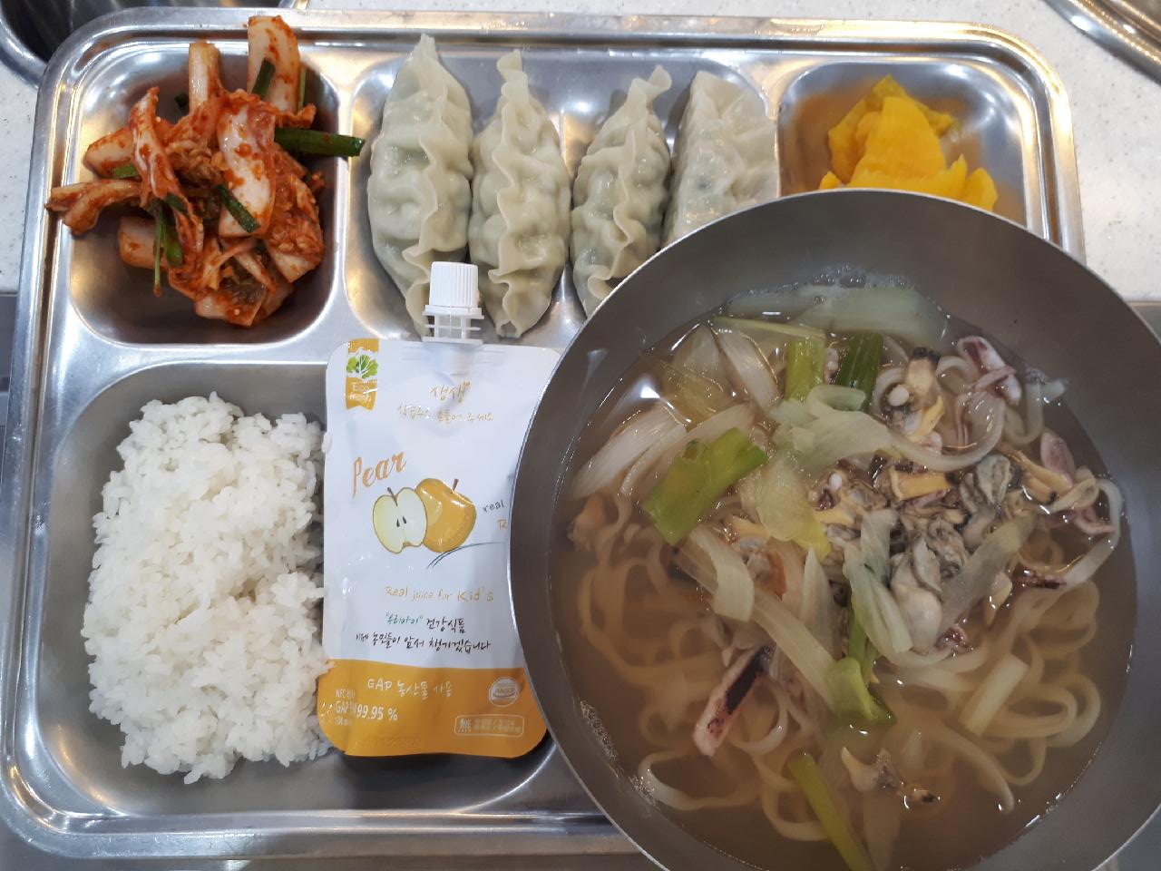 해물칼국수, 꼬들단무지, 통배추겉절이, 왕교자만두, 나주배즙