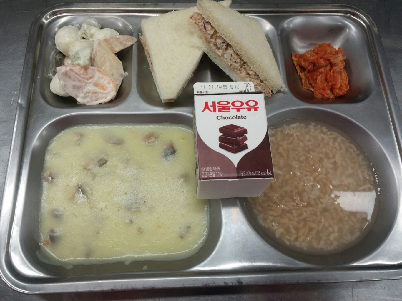 조식 : 참치샌드위치, 콘차우더스프, 단감과일샐럿, 초코우유, 슝늉/배추김치