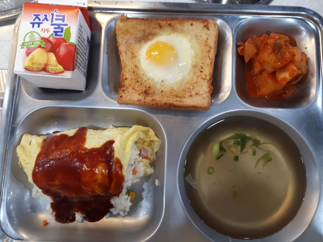 석식 : 오므라이스/케찹소스, 깍두기, 우동국물, 마늘계란빵, 피크닉