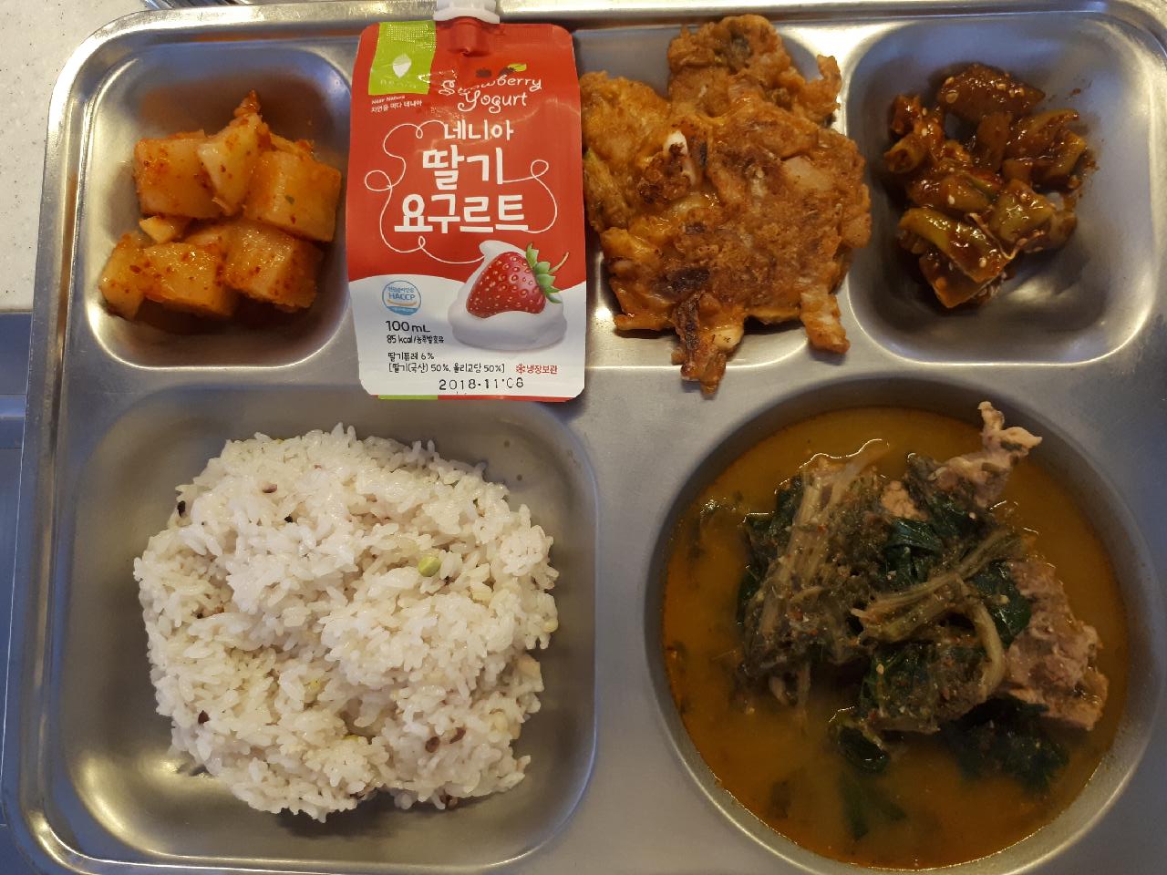 중식 : 혼합10곡밥, 돈등뼈우거지탕, 오징어김치전, 고추지무침, 깍두기, 딸기요구르트