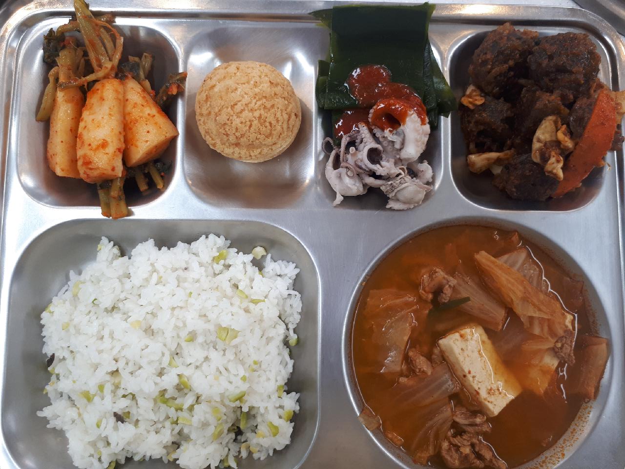 중식 : 조각콩밥, 사태김치찌개, 순대야채볶음, 주꾸미,다시마회/초장, 총각김치, 생크림비스킷아이스슈