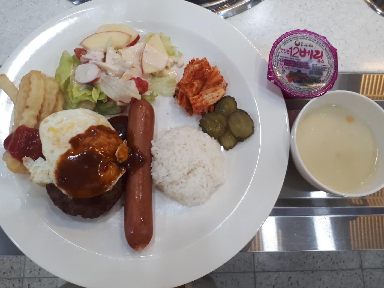 흰밥, 고메함박스테이크, 계란후라이, 소시지, 감자튀김/케찹, 옥수수크림스프, 오이피클, 양상추사과샐러드, 배추김치, 12베리쥬스