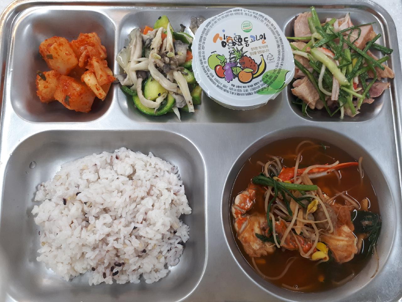 중식 : 혼합잡곡밥, 꽃게해물탕, 훈제돼지냉채, 애호박느타리볶음, 깍두기, 모듬과일