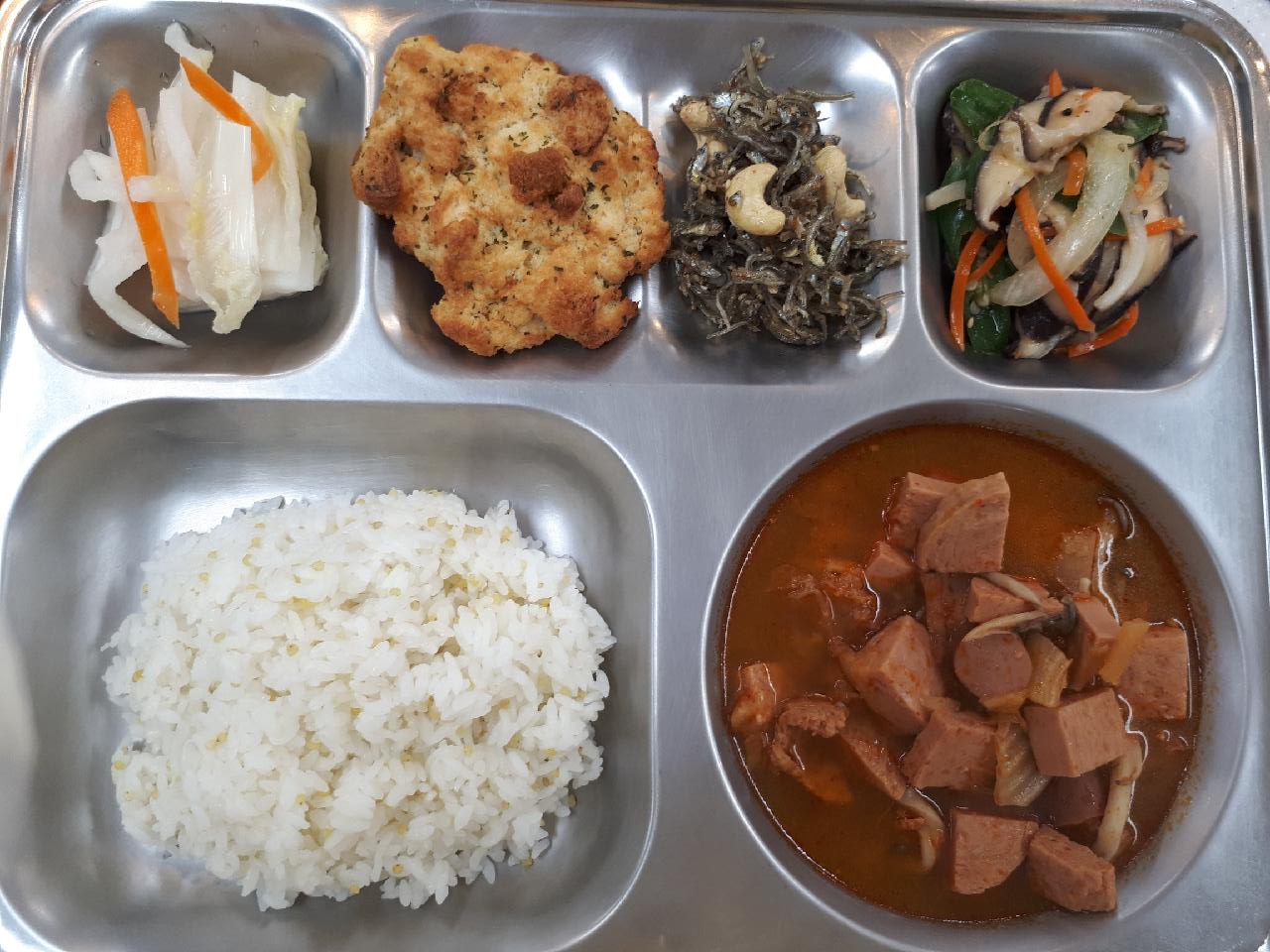 석식 : 기장밥, 부대찌개, 캐슈넛멸치마늘볶음, 표고야채볶음, 백김치, 갈릭어니언못난이빵