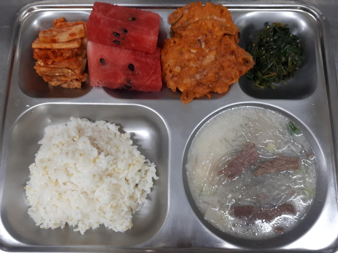 중식 : 기장밥, 설렁탕/당면, 오징어김치전, 고춧잎고추장나물, 깍두기, 수박
