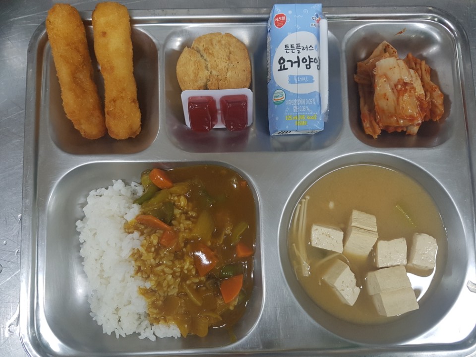 석식 : 흰밥, 팽이버섯미소국, 새우까스카레덮밥, 배추김치, 타이거비스킷/레드쨈, 오렌지요거얌얌