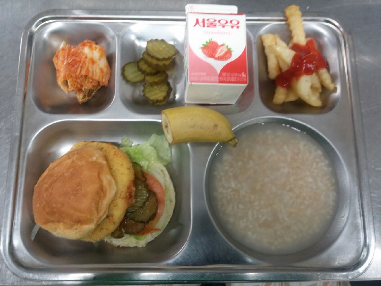 조식 : 리얼치즈버서, 감자튀김/케찹, 바나나, 딸기우유, 숭늉/배추김치