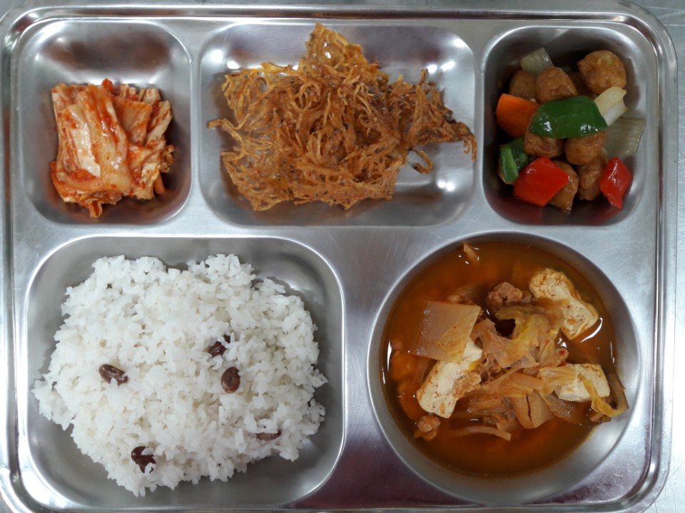 조식 : 강낭콩밥, 돈육김치찌개, 어묵야채조림, 뱅어포튀각, 배추김치