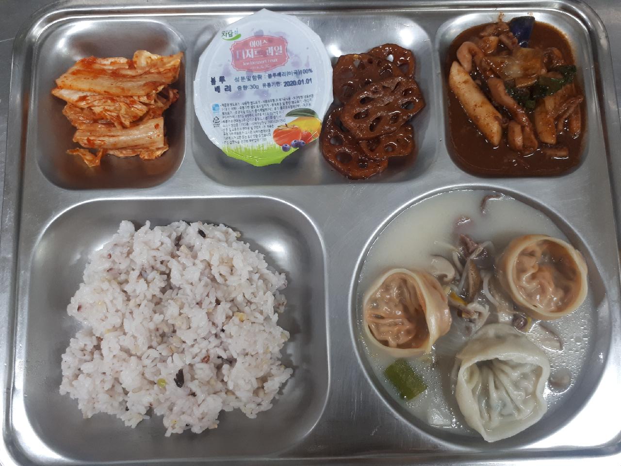중식 : 혼합10곡밥, 김치만두전골, 주꾸미철판볶음, 연근조림, 배추김치, 아이스블루베리