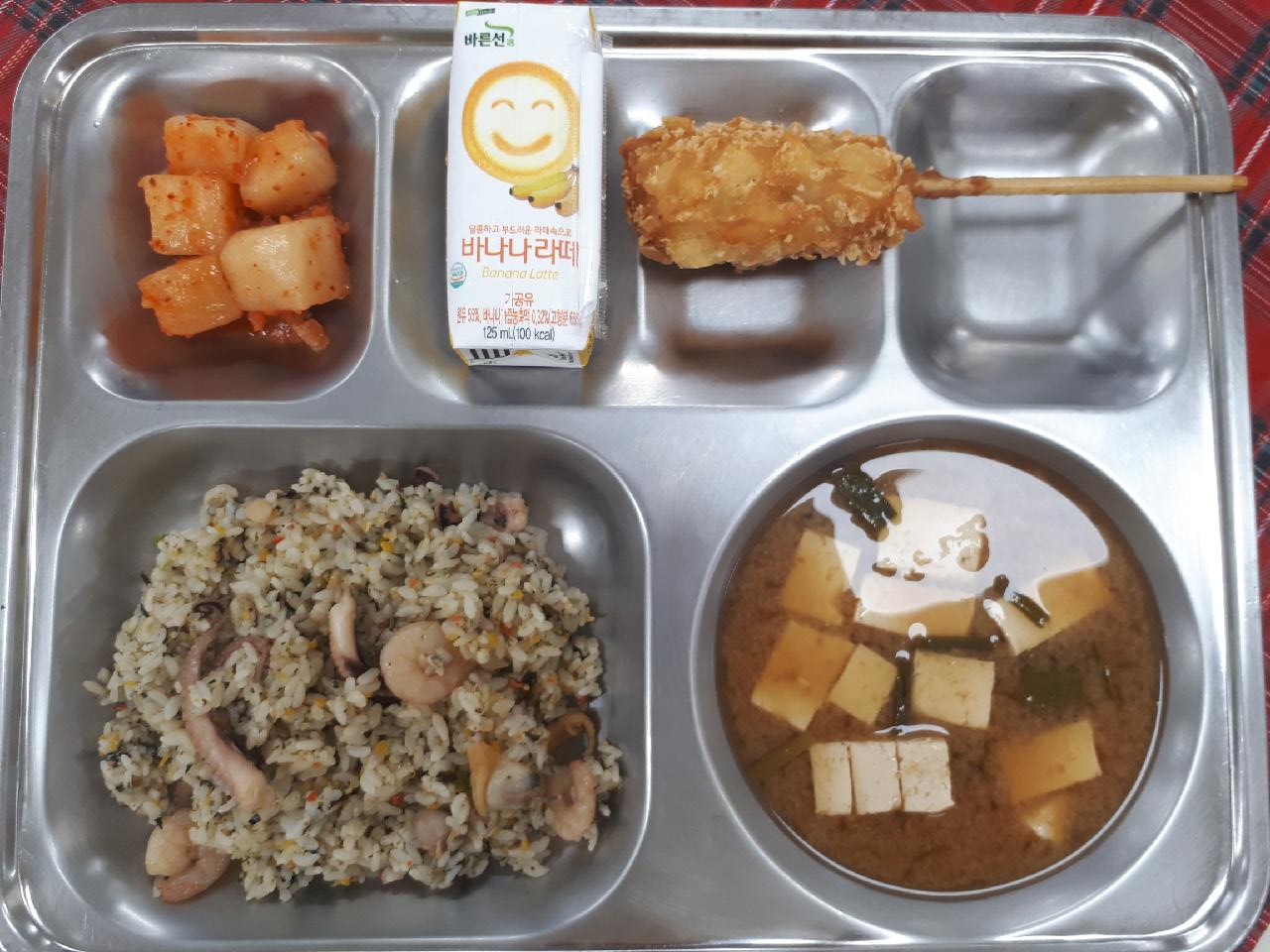 석식 : 해물필라프, 미소된장국, 깍두기, 도깨비감자핫도그, 바나나라떼
