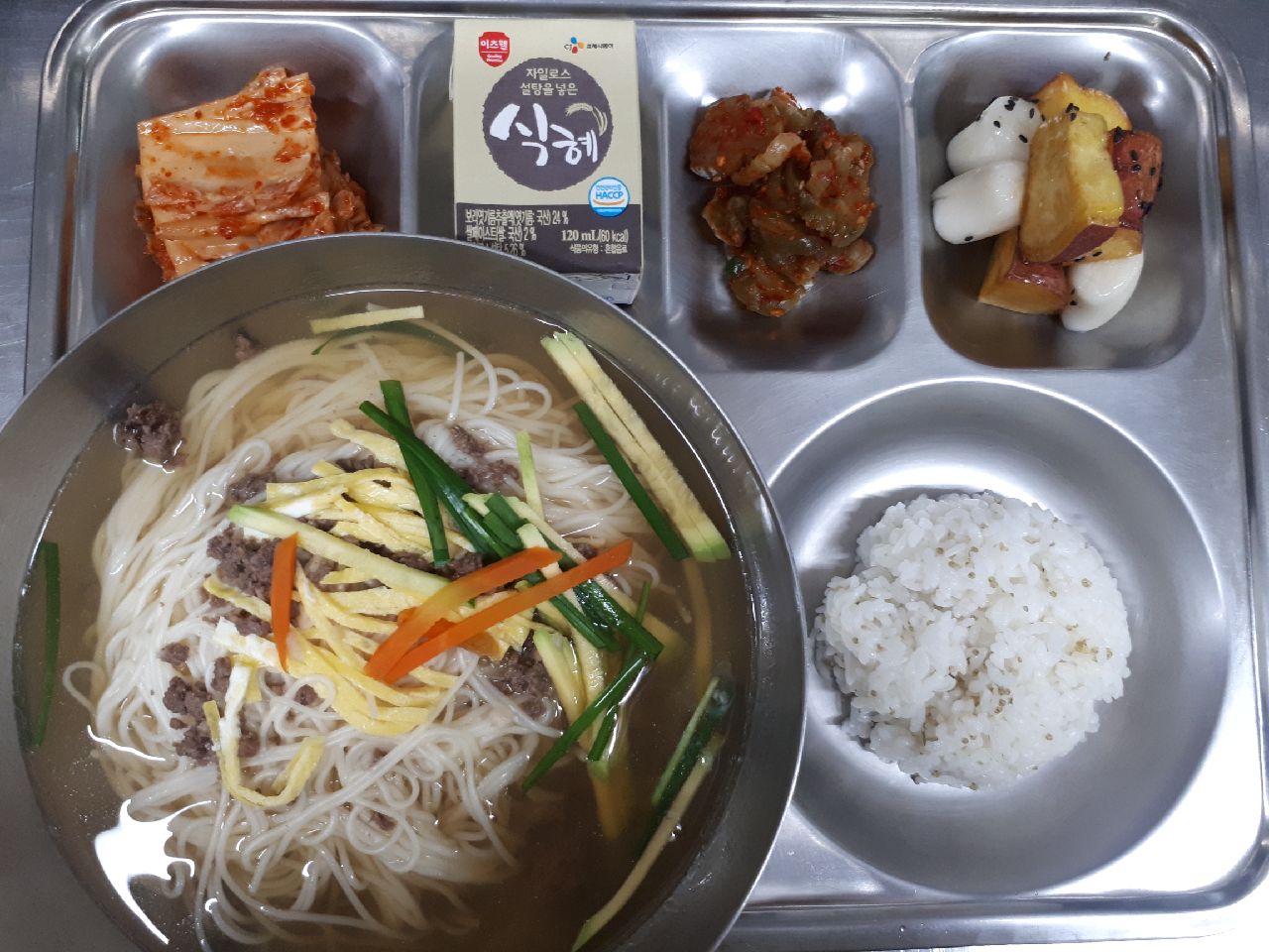 중식 : 잔치국수, 오이장아찌무침, 배추김치, 고구마가래떡맛탕, 식혜