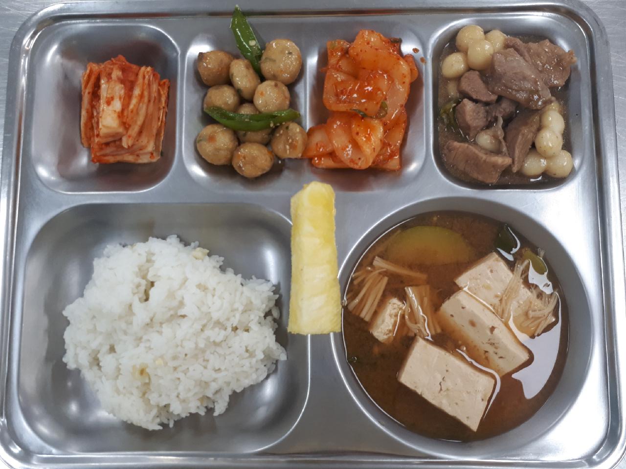 중식 : 옥수수밥, 팽이된장국, 사태떡찜, 노각생채, 우엉어묵고추볶음, 배추김치, 골드파인애플