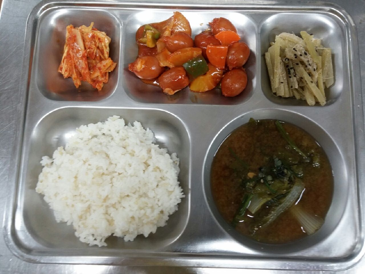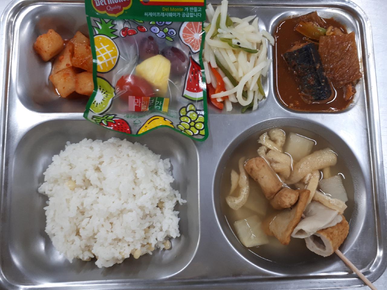 석식 : 완두콩밥, 꼬치어묵탕, 고등어김치조림, 감자채피망볶음, 깍두기, 삼색과일