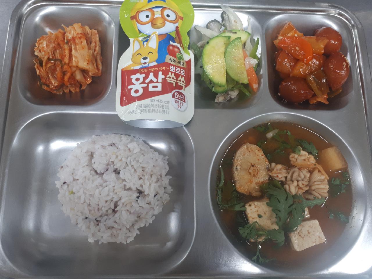 석식 : 혼합잡곡밥, 동태찌개, 비엔나파인애플조림, 애호박느타리볶음, 배추김치, 홍삼쏙쏙
