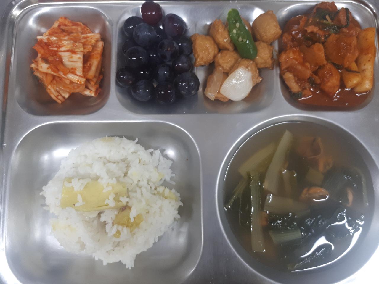 중식 : 고구마밥, 홍합된장국, 철판닭갈비, 완자어묵볶음, 배추김치, 포도