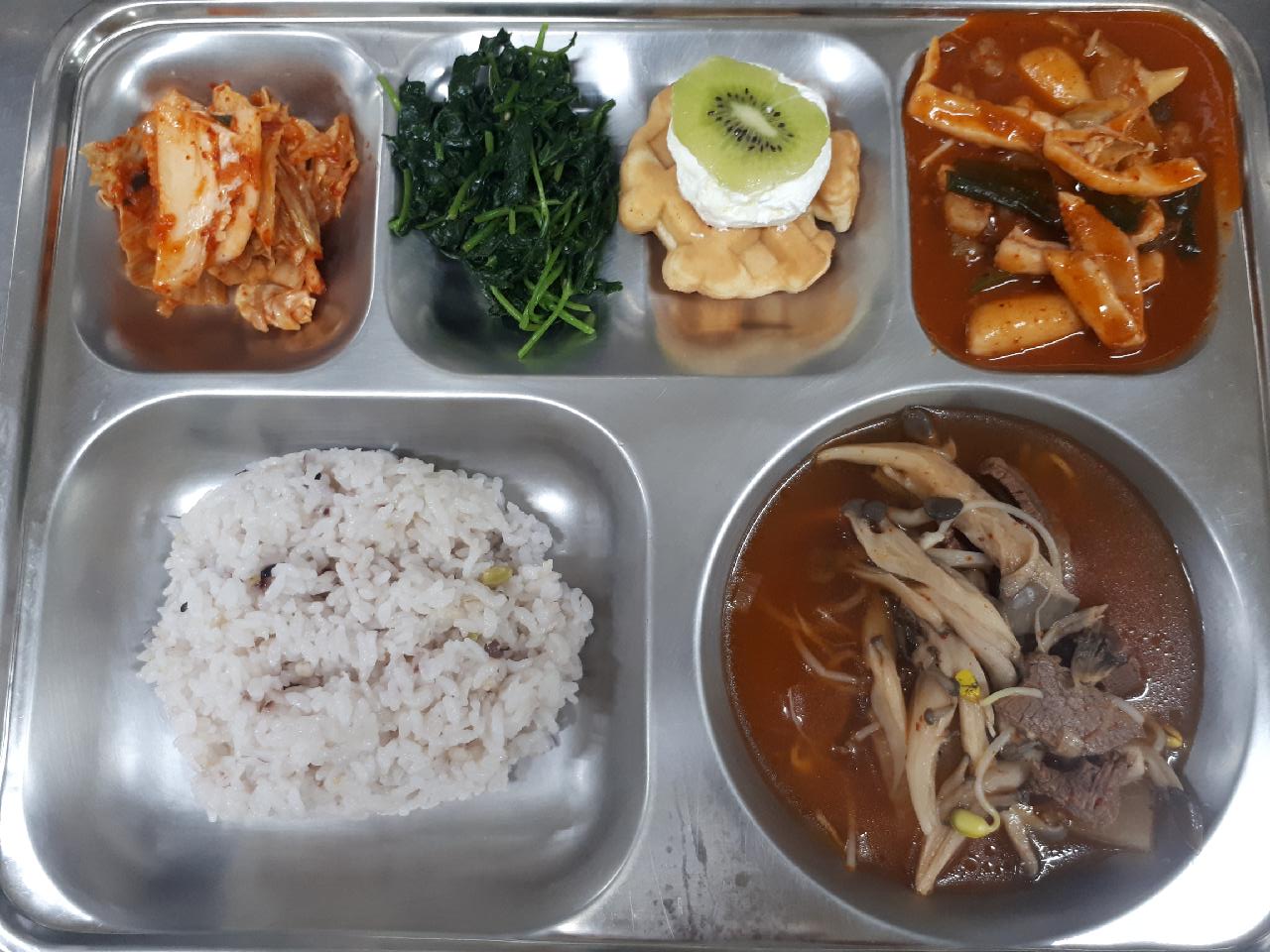 석식 : 혼합잡곡밥, 느타리소고기국, 매운해물떡찜, 참나물무침, 배추김치, 수제와플
