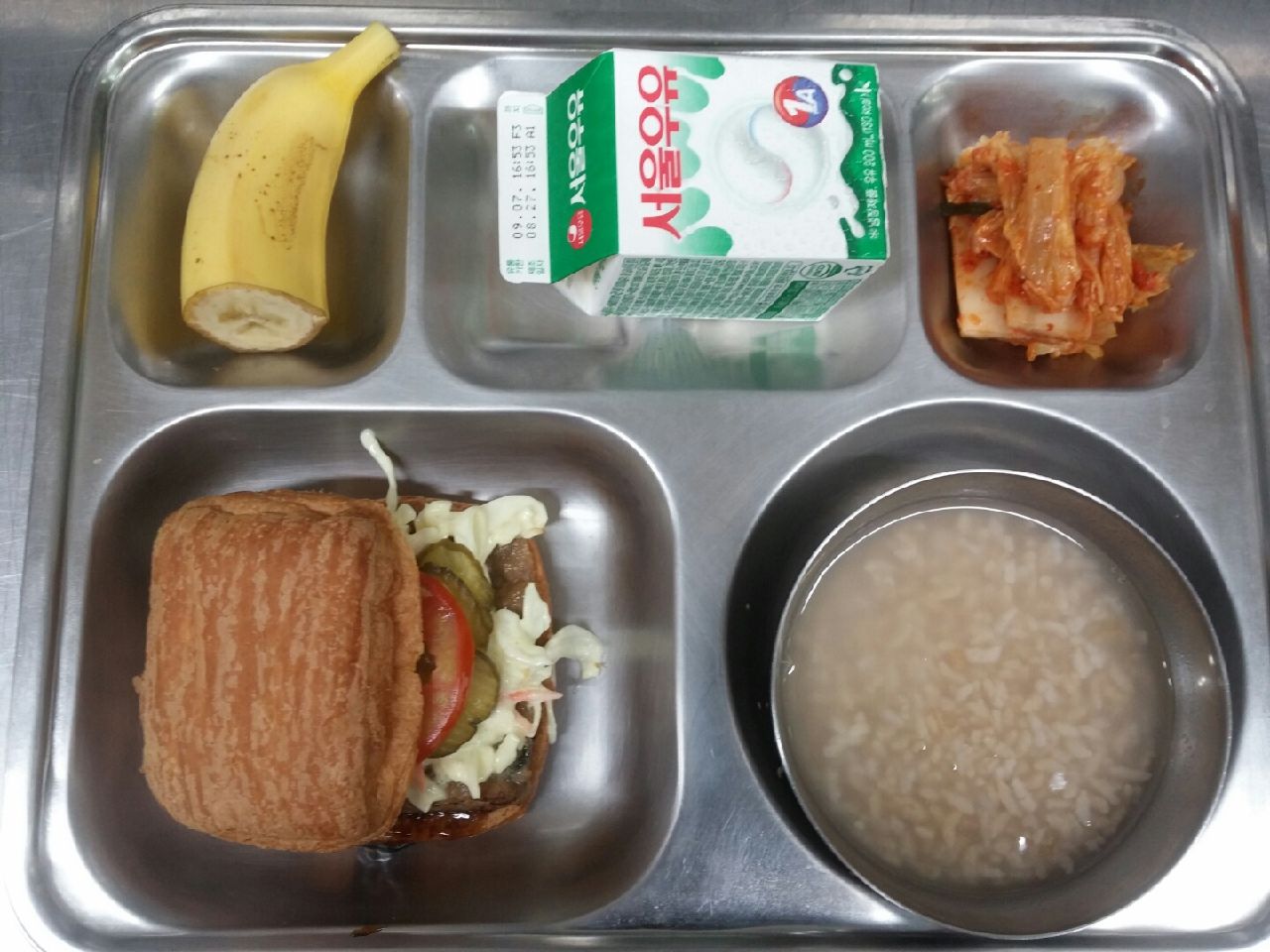 조식 : 패스츄리햄버거, 우유, 바나나, 숭늉/배추김치
