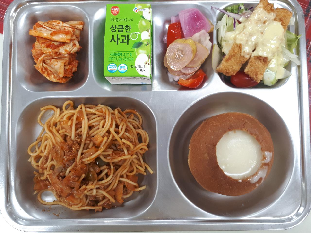 중식 : 미트스파게티, 빠네스프, 치킨케인즈샐러드, 야채아삭피클, 배추김치, 상큼한능금쥬스