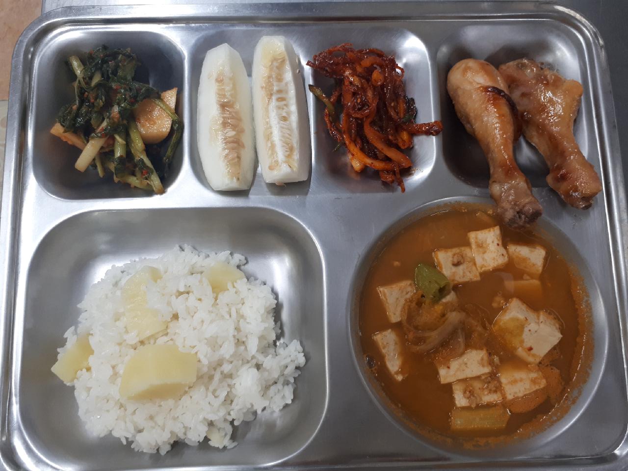 중식 : 감자밥, 청국장찌개, 고추간장양념치킨, 진미도라지무침, 열무김치, 참외