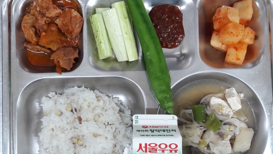 조식 : 옥수수밥, 두부버섯전골, 돈사태김치찜, 풋고추와오이/고추장, 깍두기, 우유