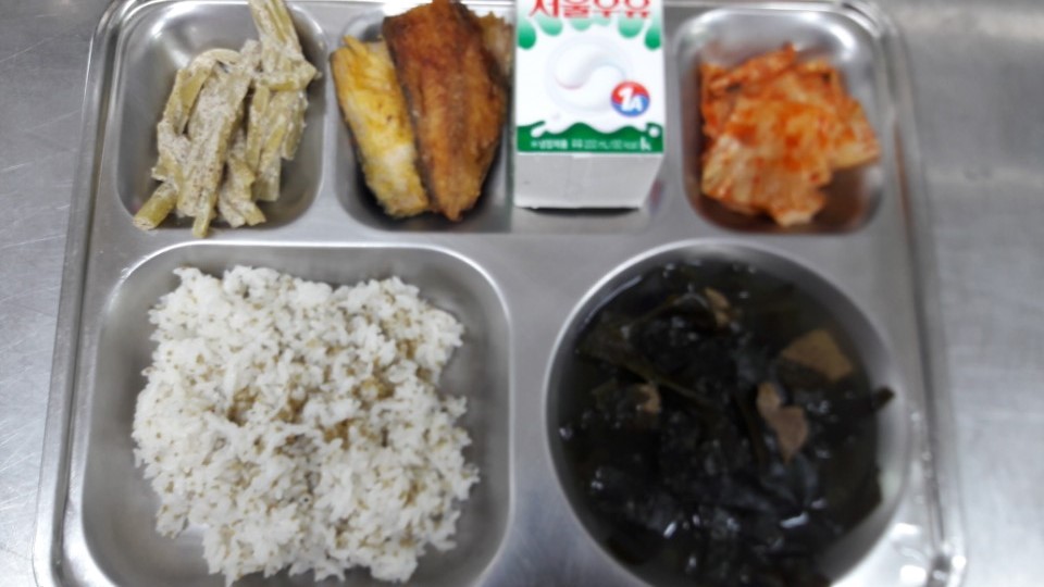 조식 : 차조밥, 소고기미역국, 고등어카레구이, 머위대들깨무침, 배추김치, 우유