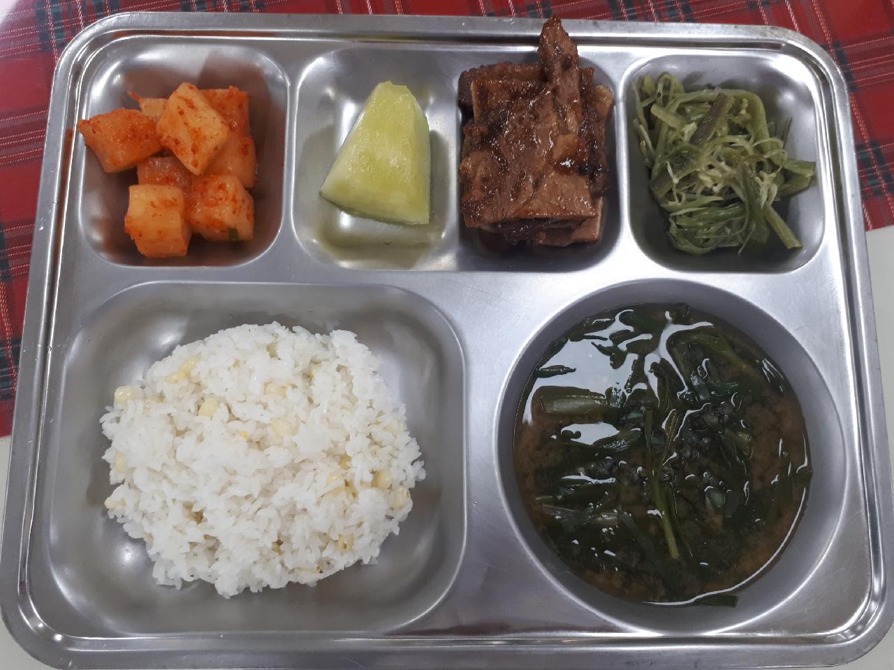 중식 : 옥수수밥, 부추올갱이국, 목살스테이크, 미역줄기팽이볶음, 깍두기, 메론