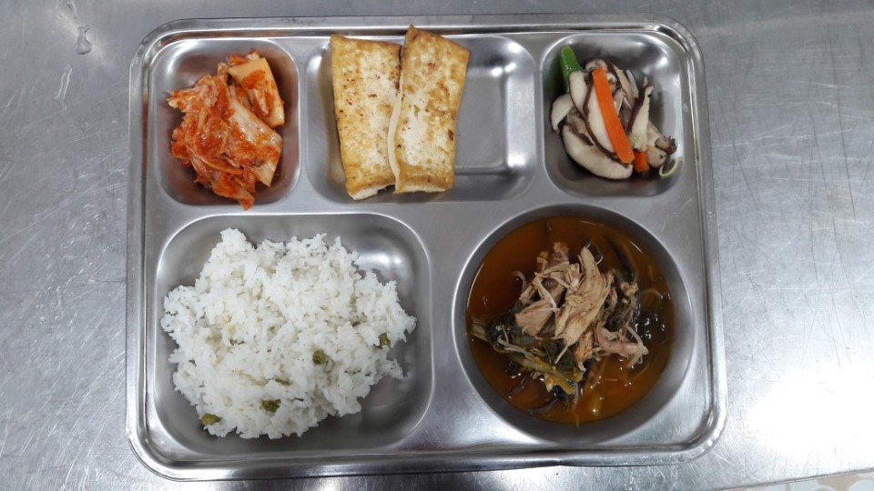 조식 : 완두콩밥, 닭개장, 표고야채볶음, 두부구이/양념장, 배추김치