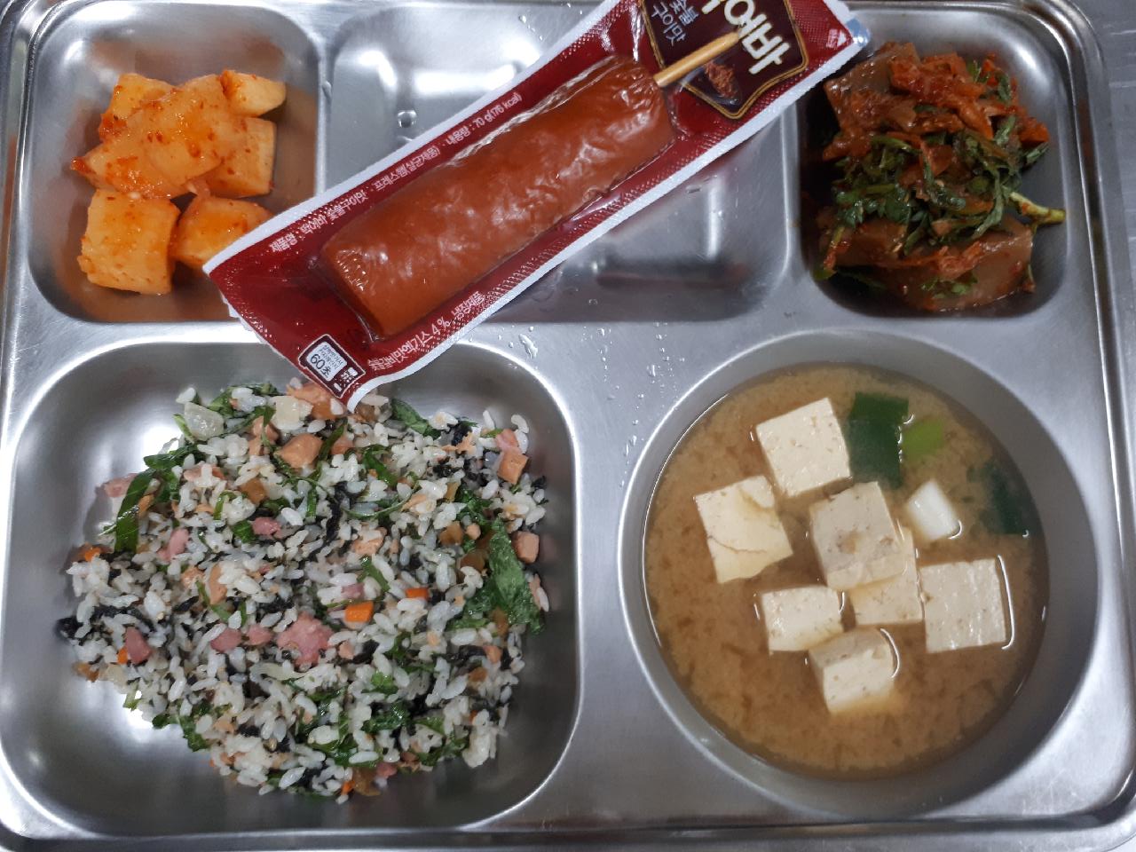 석식 : 오리훈제볶음밥, 미소된장국, 도토리묵김치무침, 깍두기, 핫바