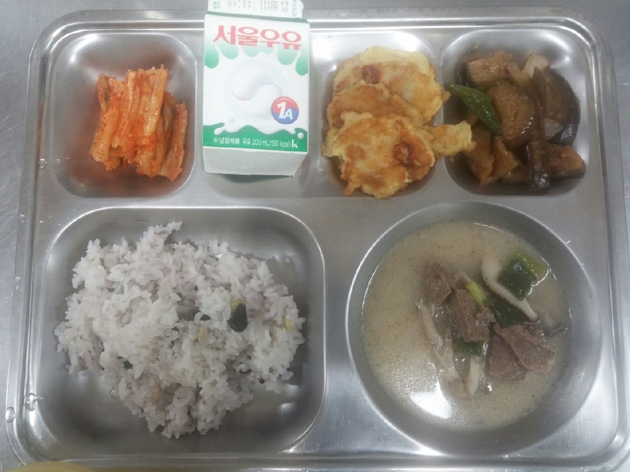 조식 : 서리태콩밥, 버섯들깨국, 생선전, 가지나물, 배추김치, 우유