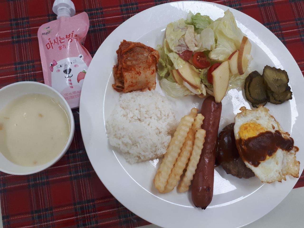 중식 : 흰밥, 고메함박스테이크, 옥수수크림스프, 양상추사과샐러드, 감자튀김/케찹, 오이피클, 배추김치, 마시는빙수