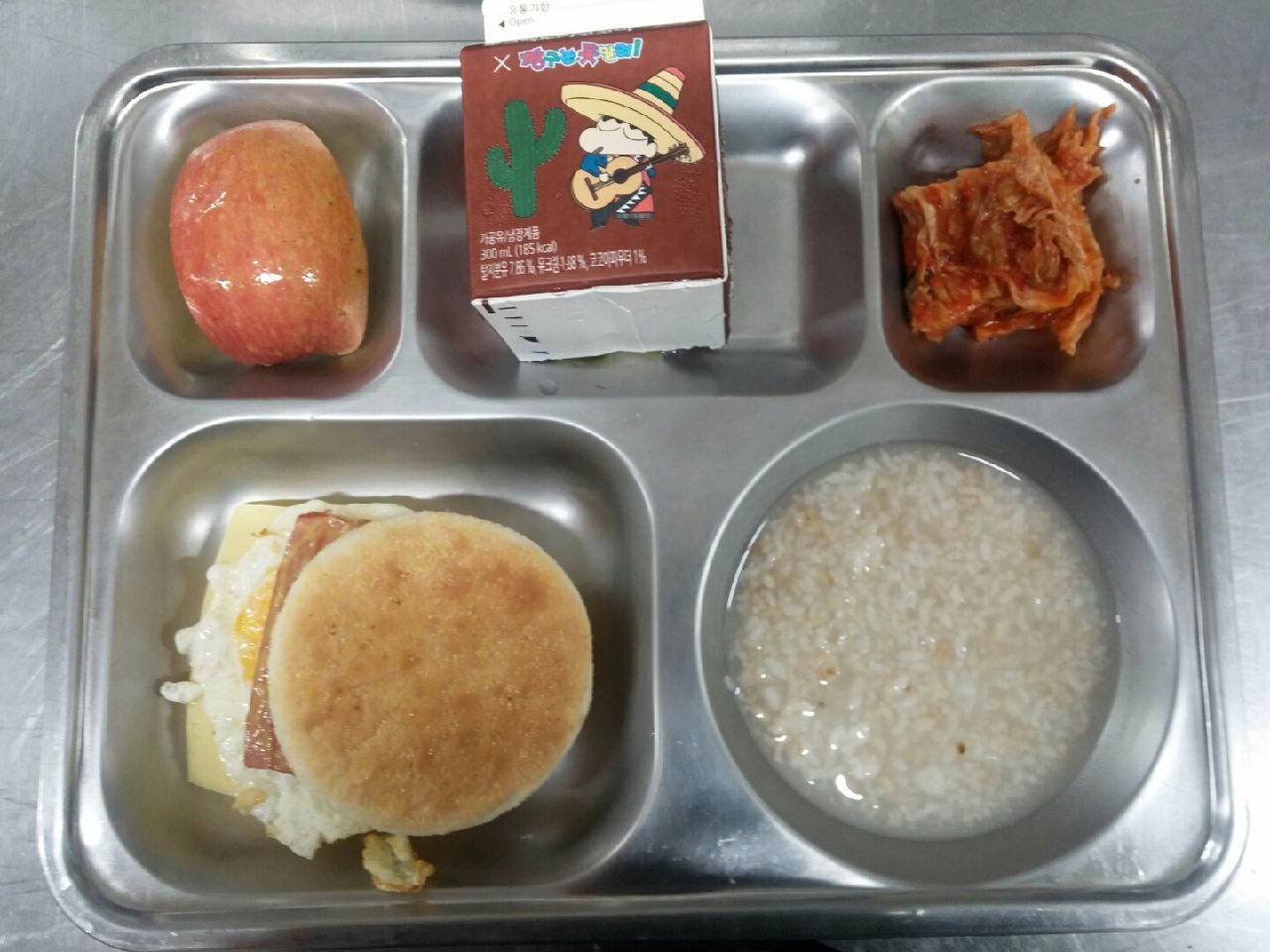 조식 : 맥모닝, 밀크코코아, 사과, 숭늉, 배추김치