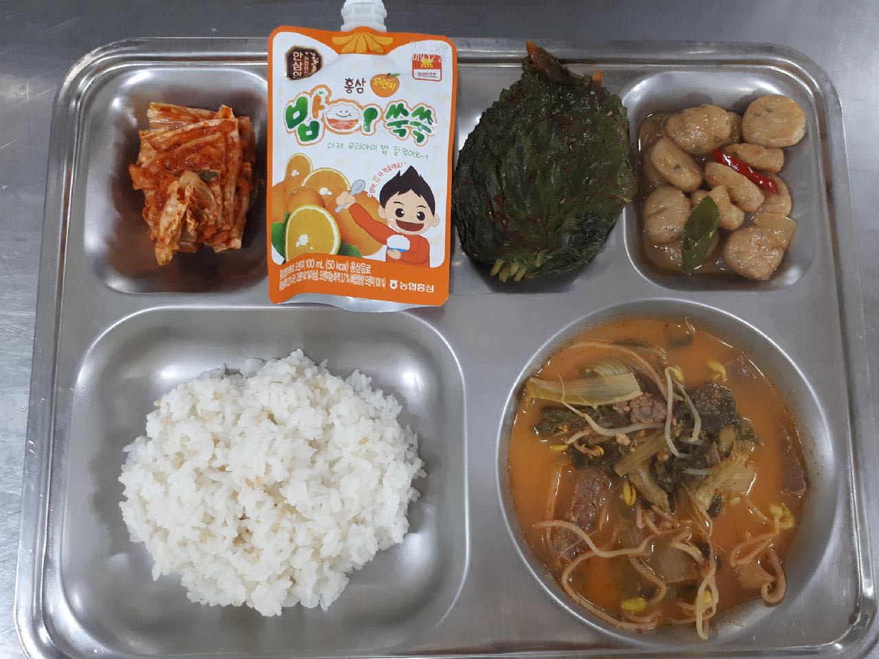 석식 : 발아현미밥, 사골우거지국, 우엉어묵볶음, 깻잎찜, 깍두기, 홍삼오렌지쥬스