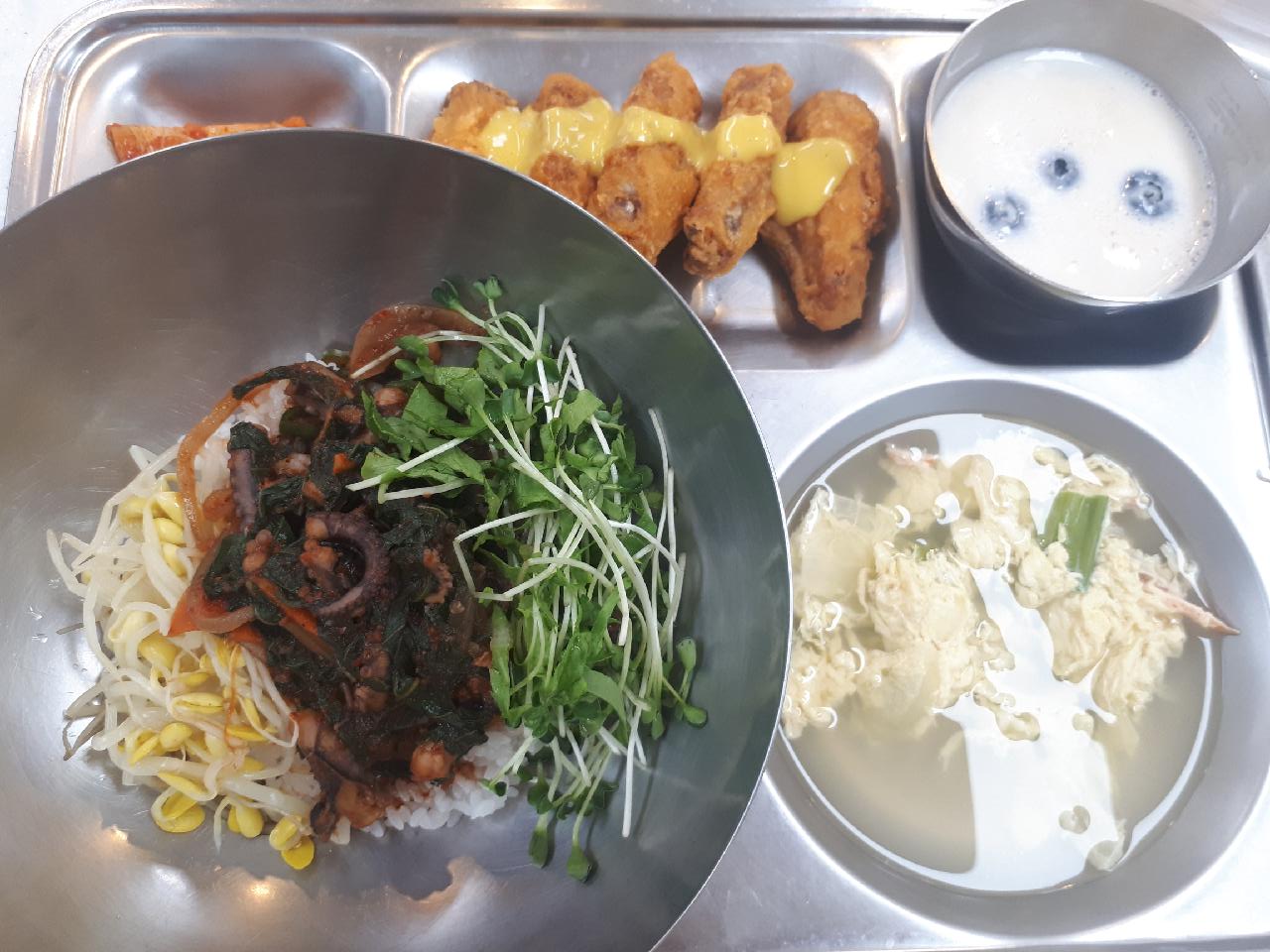 중식 : 낙지야채비빔밥, 탕파국, 깍두기, 닭날개튀김/머스터드, 유자바나나블루베리스무디