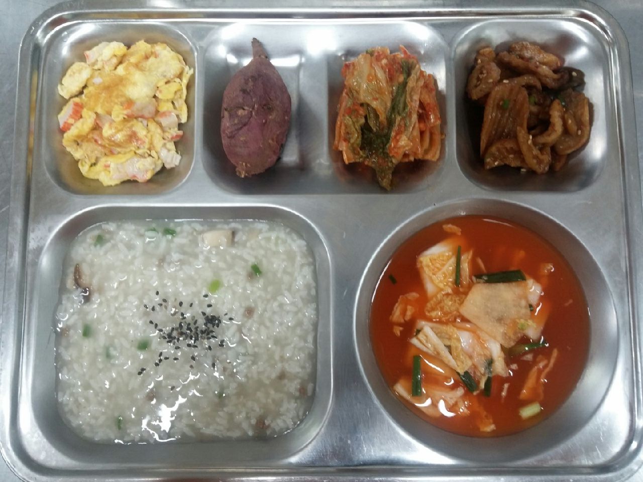 조식 : 장국죽, 나박김치, 맛살계란볶음, 오복채무침, 배추김치, 꿀고구마