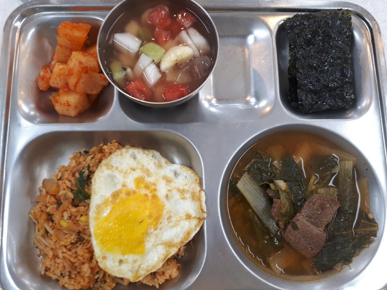 중식 : 콩나물김치볶음밥, 소고기배추국, 계란후라이, 구운김, 깍두기, 과일화채