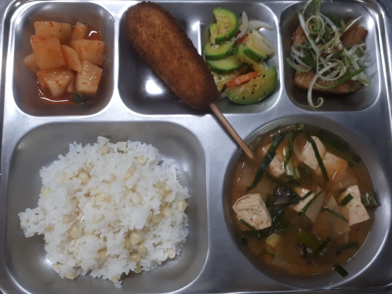 석식 : 옥수수밥, 우렁된장찌개, 코다리구이, 호박새우젓볶음, 배추김치, 모짜렐라핫도그