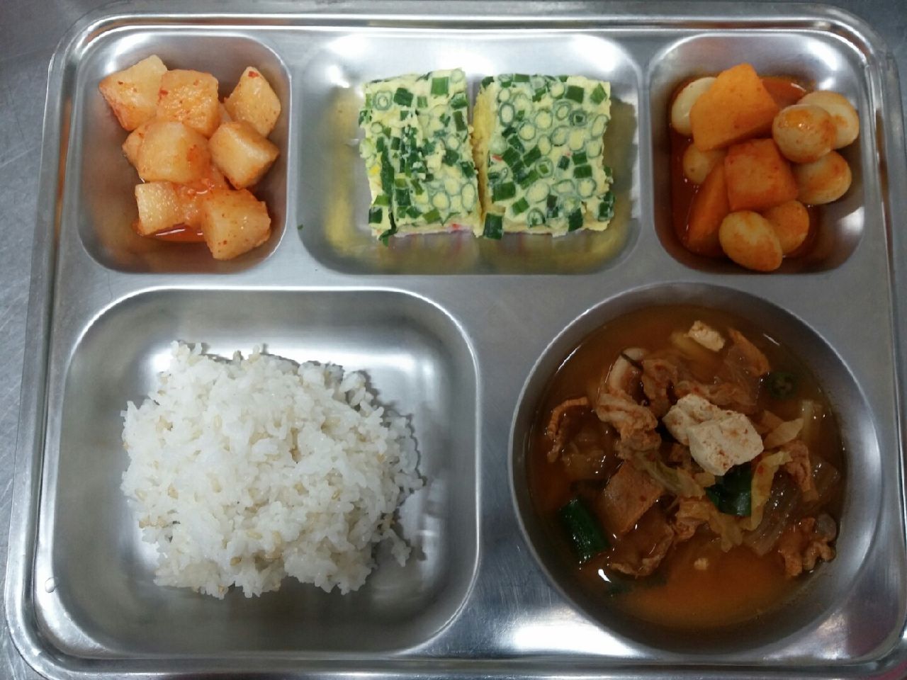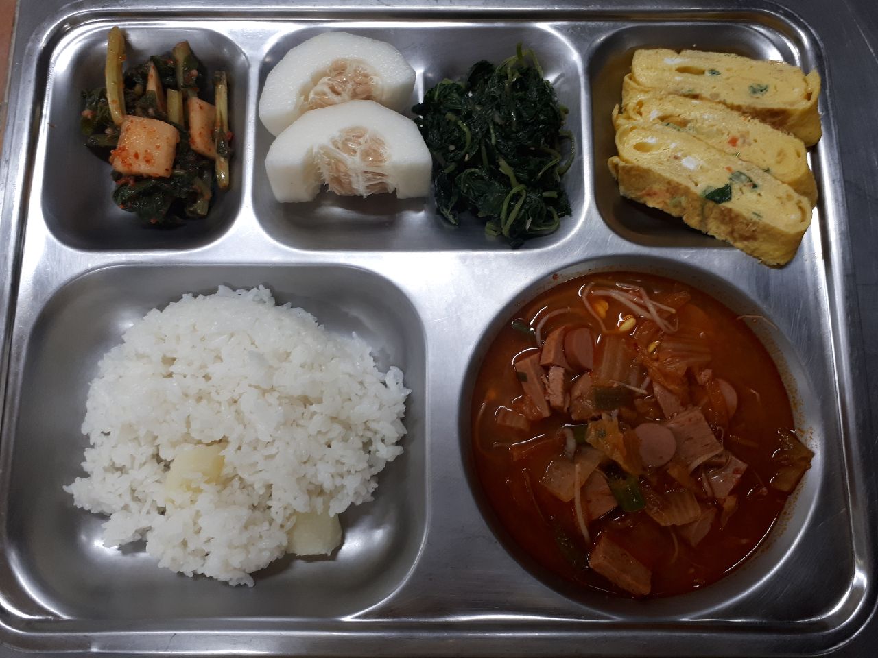 조식 : 발아현미밥, 돈육김치찌개, 메알감자매운조림, 맛살계란찜, 깍두기